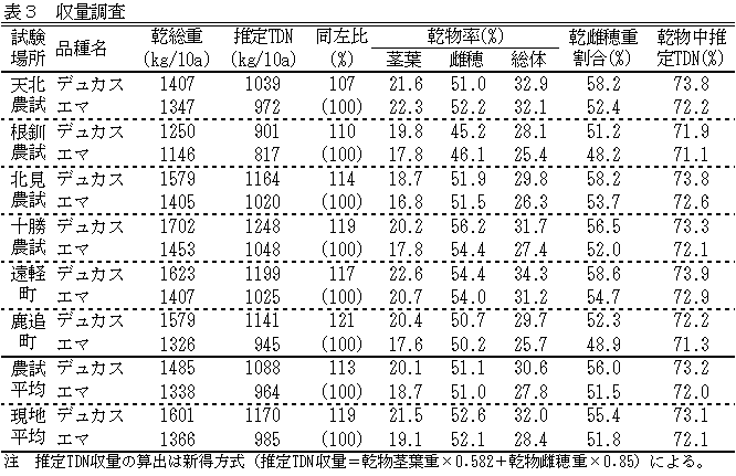4) 収量性・乾物特性:乾総重、推定TDN収量は多い。乾雌穂重割合は高く、乾物中推定TDN割合はやや高い。