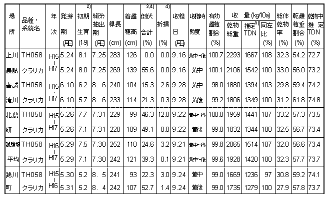 注 1) 畜試滝川試験地の平成16年は、春先の天候不順による播種の遅れとその後の湿害による生育異常のため、倒伏および折損を除き参考成績とした(倒伏合計と折損はH15〜1
