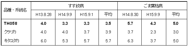 表2 病害抵抗性に関する特性検定試験結果(北海道農研)1,2)