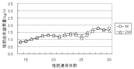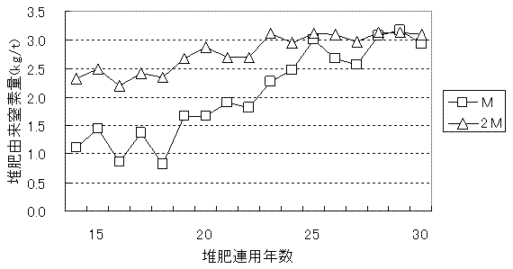 堆肥の連用により、作物に吸収される堆肥由来窒素量は経年的に増加し、連用30年目における堆肥由来窒素量は、生育期間の長いてんさいで堆肥1t当たり約3kgであったが、春まき