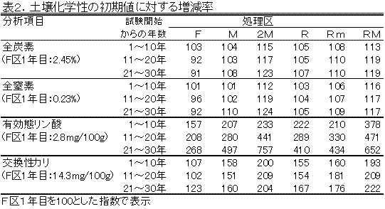 土壌全炭素および全窒素の増減と有機物施用量とは有意な正の相関が認められ(表1)、有機物を全く施用しないF区では、全炭素、全窒素とも減少し、残さを還元した場合(R区)は5