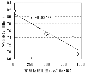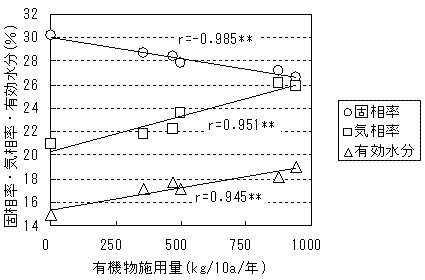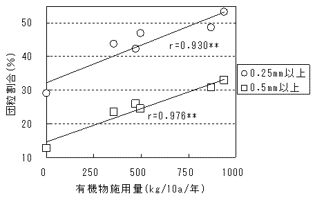 用量との間には有意な正の相関が認められ、有機物の連用による通気性や保水性の上昇、排水性の向上がうかがえた(図1)。