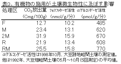 有機物の施用により、土壌中のフォスファターゼやα-グルコシダーゼ活性および炭酸ガス放出量の増加が認められた(表3)。また、それらは有機物施用量と有意な正の相関が認めら