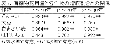 有機物の長期連用による増収効果はてんさいで最も大きく、ばれいしょ、春まき小麦がこれに続き、大豆においては増収効果は10%以下であった(表4)。また、各作物ともに有機物施