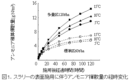 2) 環境影響評価として、アンモニア揮散量と硝酸態窒素溶脱量を推定した。ふん尿施用時のアンモニア揮散量は、気温、土壌水分などの異なる条件で得た試験結果(図1)に基づいて設定し