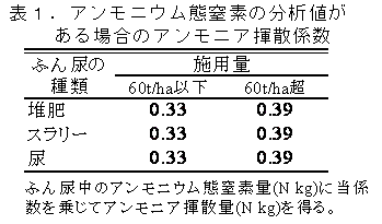 た揮散係数(表1)を、施用するふん尿のアンモニウム態窒素量に乗じて求める。