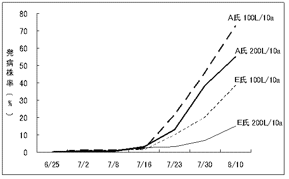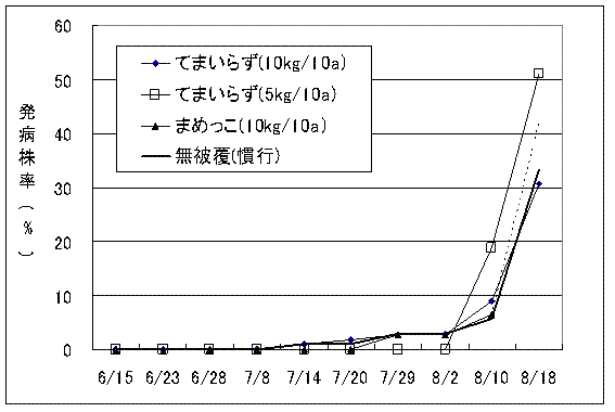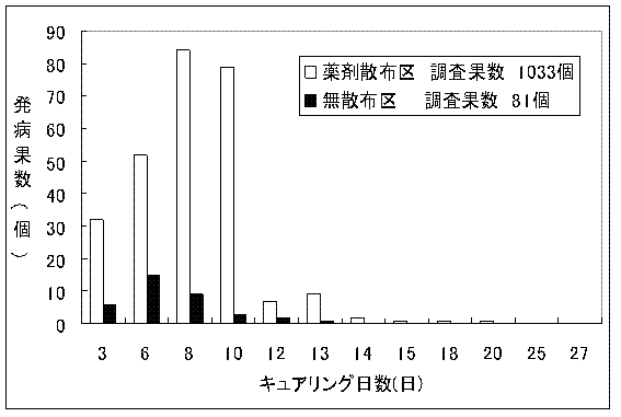 | ・発生ほ場の予測 :既発ほ場においては、3〜4年の輪作を行っても発生する ・好適気象条件:つる出し以降の降雨後に発病が増加する ↓ ・ほ場での対策 ○薬剤散布 散布量 200L/10a ・トンネル除去時(6月中旬)から薬剤散布を行う ・ほ場での発病株率を減らし、収穫後の発病果を減らす ↓ ・収穫後の対策 ○14日間のキュアリングと発病果実の選別 |