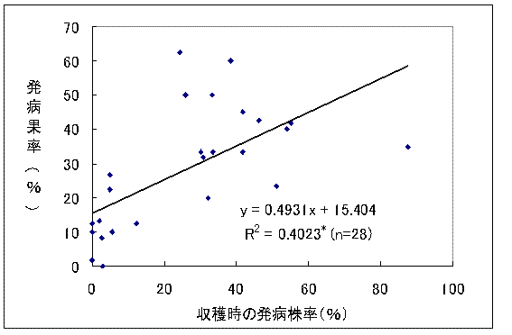 図4 収穫時の発病株率と収穫後の発病果率の関係
