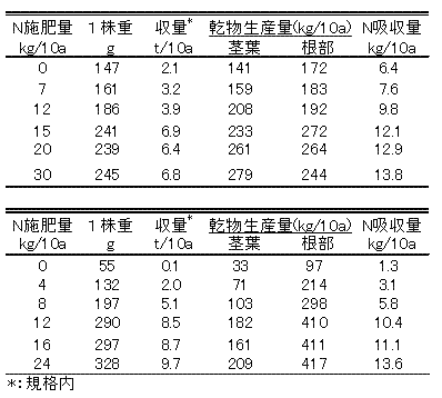 増加し(表2)、さらにこの施肥量において施肥窒素利用率が最も高かった。したがって窒素肥沃度低水準の場合は、ハウスおよびトンネル作型でそれぞれ15および12kg/10aが、目標収