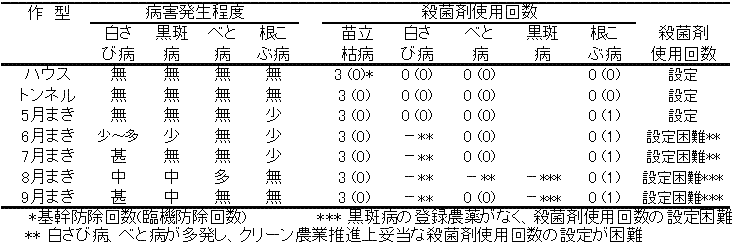 (表4)。病害発生状況より各作型における適正な殺菌剤散布回数を設定した(表4)。窒素減肥による軟腐病防除を検討したが、軟腐病が少発生であったため、効果を明らかにできなか