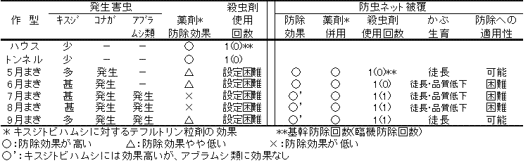 ある。しかし、防虫ネット被覆によりかぶの葉の徒長や品質低下があり適用時期は限られた(表5)。