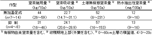 1)セルリーに対する窒素施用量(平均値、kg/10a)は無加温促成作型が44、抑制作型が31で収穫期の窒素吸収量(各々23、24)より多かった(表1)。作付け体系では一部でトマトとの交互作がみられたが、20年以上の長期連作が多数を占めた。土壌の無機態窒素量は早春を除き平均値で50 kg/10a(0〜60 cm土層)以上と多量で、熱水抽出性窒素量も高く、多肥および連作の影響がうかがわれた。
