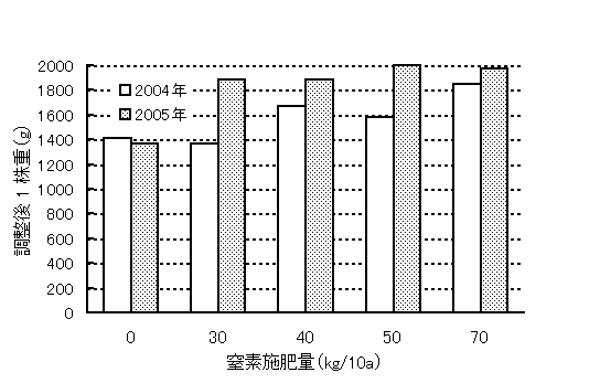 図1 窒素施肥量が収穫期セルリーの1株重におよぼす影響