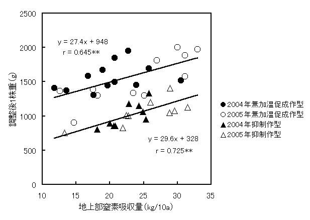 2)収穫期のセルリー1株重や地上部窒素吸収量は、無加温促成および抑制作型のいずれでも、施肥量の増加に伴いおおむね増大する傾向を示した(図1)。しかし、その増大程度は年次や作型によって異なり、同一施肥量に対する1株重や窒素吸収量は一定ではなかった。一方、1株重と窒素吸収量との間には、年次を問わず作型ごとに有意な正の相関が認められた(図2、表3)。