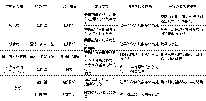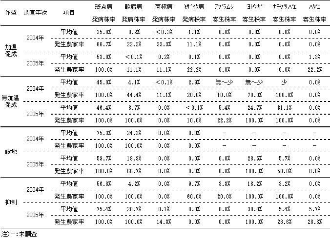 4)斑点病、軟腐病、菌核病、モザイク病、ナモグリバエ、モモアカアブラムシ、ヨトウガ、ハダニが発生しており、このうち斑点病、軟腐病、モザイク病(アブラムシ)、ヨトウガが重要であった(表2)。