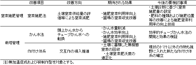2)窒素施肥管理および栽培管理に関する改善方向は無加温促成および抑制作型を対象とする。