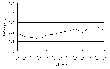 2)根釧農試の個別型バイオガスプラントにおいて、平均有機物濃度7.5%のスラリーを日量3m3供給し、バイオガス生成量を測定した。安定した運転状況が認められた2004.9〜2005.9の