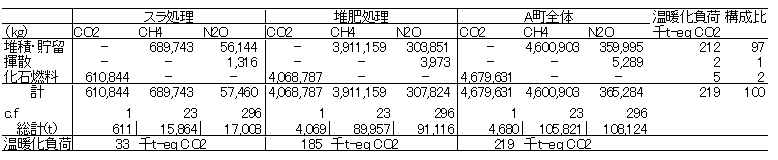 3)根室管内A町を例に、A町全体の酪農ふん尿処理に起因する温暖化負荷を、地域単位LCAによって計算した。結果、1年間で二酸化炭素に換算して約21万9千トンであった(表1)。