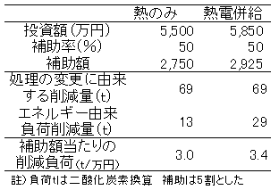合、二酸化炭素に換算した温暖化負荷は熱のみの利用で17t、熱電併給で1tとなり、熱電併給プラントでは温暖化負荷のほぼ全てを削減する効果があることがわかった(表2)。