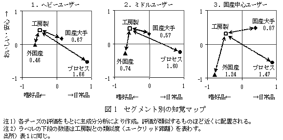 価されている。一方、ミドルユーザーでは工房製チーズは国産大手と、ヘビーユーザーでは外国産と評価が類似し、それらと競合する関係にある(図1)。また、各セグメントの潜在的な