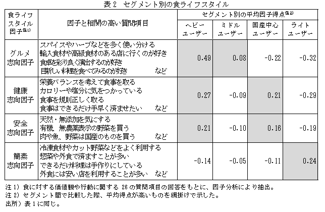 はグルメ、健康、安全志向が高く、それぞれの食ライフスタイルにあった販売戦略が必要である(表2)。