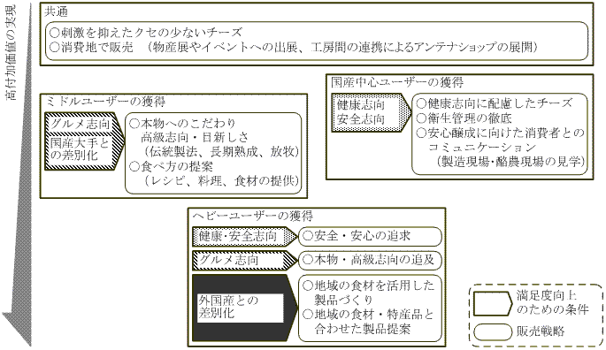 セグメントごとに販売戦略を整理すると、(ア) 健康・安全志向の高い国産中心ユーザーについては、健康に配慮したチーズの開発や、衛生管理の徹底、消費者との密接なコミュニケーションによって安心を醸成すること、(イ)ミドルユーザーについては、グルメ志向が高く、また国産大手との差別化が必要なことから、伝統的な製法を取り入れるなど本物・高級志向を追及したり、食事を楽しむグルメ志向の性格に合わせて製品にあったレシピや食材の提供などトータル的な製品提案によって購買を促すことが重要である。(ウ) さらに高付加価値化を実現できるへビーユーザーの獲得にあたっては、安全・安心の追求や本物・高級志向の追求に加え、地域の食材を活用した製品の展開や地元食材とあわせて製品を提案するなど製品や工房の地域性を強調して、外国産との明確な差別化を図る必要がある(図2)。