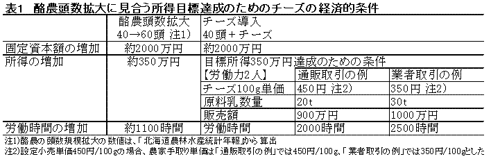 チーズ導入に要する投資は約2,000万円であり、これは経産牛40頭程度と60頭程度の経営の農業固定資本額の差とほぼ同値であった。このときの農業所得の差は350万円であった。