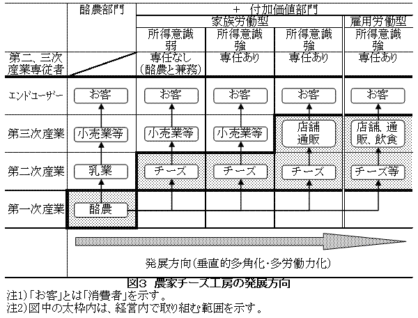 5)事例のトレースから、農家チーズ工房の発展方向として、酪農(第一次産業)を経営の基軸にしながら、付加価値部門の経済性も意識しつつ、労働力を増加させ、加工業(第二次産