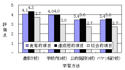 1)小学校を対象とした調査では、農家における農業体験学習は、農業の他の学習方法に比べて、「社会的項目」をはじめより高い評価を受けている(図1)。あわせて農業体験学習は