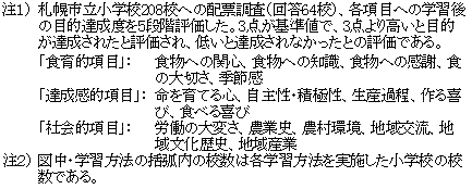 ①アンケート調査(小学5年生・中学2年生・保護者)による農業体験学習の効果の把握、②農家調査による受入方法と問題点の把握、③小学校(教員)への配票調査による実施目的、実施状況及び評価の把握