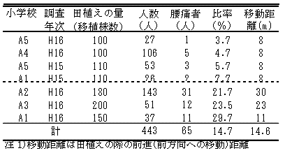 5)田植え体験で小学生は1人150株(6㎡)を境に痛みや満足感に変化が生じるため、田植え体験に必要な面積を決める指標となる(表2)。田植えは1人2列を受け持つとスムーズな作業