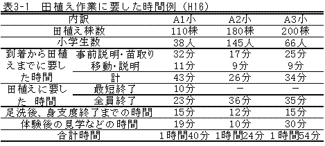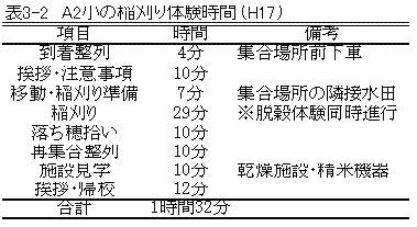 が行える。農業体験学習の時間は2時間が限度となる。田植えでは1人当たり田植え株数で、稲刈り体験は稲束を作るかどうか等で作業時間が異なるため、体験内容や時間配分を