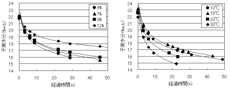 1)菜豆子実と成形バレイショデンプンの混合乾燥では,恒温器内温度が高いほど,またデンプンの初期水分が低いほど子実水分の低下は速やかであった(図2)。