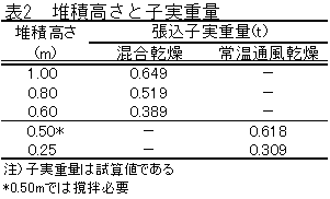 3)堆積高さ100cmまでの混合乾燥が可能であり,単位面積当たりの処理量は常温通風乾燥と同程度以上で,撹拌が必要なく省力的である(表2)。