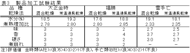 4)デンプン初期水分が5〜6%であれば,混合乾燥子実の吸水,煮熟特性は対照の常温通風乾燥子実と比較して大差はなく,製品評価は良好であった(表3)。