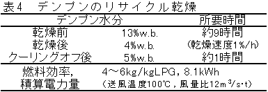 クーリングが約1時間,合計約10時間であり,一時貯蔵時の結露や著しい水分上昇はなかった(表4)。デンプンをリサイクル乾燥する場合の燃料効率は4〜6kg/kgLPG,積算電力量