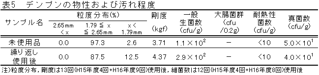 7)13回の繰り返し使用では,未使用品と比較して粒度は細かくなるが,剛度の低下はなかった。また,デンプンの汚れ程度(細菌数)は,12回の繰り返し使用で増加することはなく,未使
