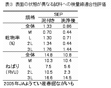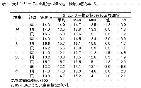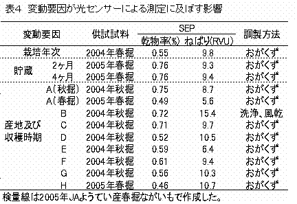 3)栽培年次、収穫時期、貯蔵期間、産地等の変動要因が光センサーによる乾物率の測定に及ぼす影響について調査したところ、いずれの変動要因についても影響が小さいと判断さ