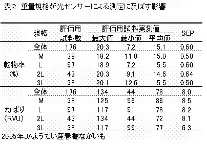 誤差SEPが乾物率で0.50〜0.64%、ねばりで6.3〜8.5RVUとなりいずれも目標とするSEPの値(乾物率;1.60、ねばり;10)以下であり、重量規格の影響を受けることなく精度良く推定が