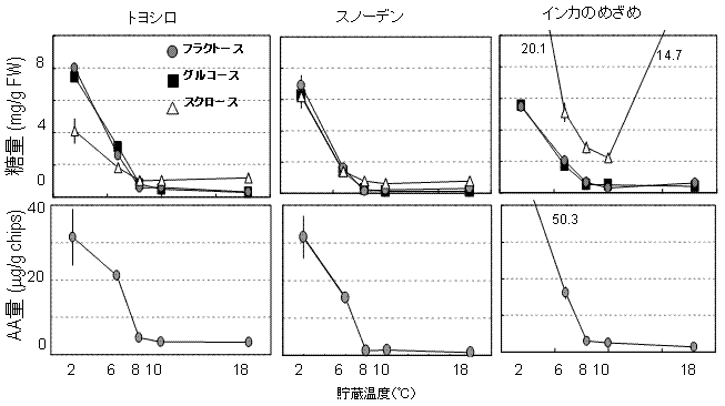 (1)貯蔵温度の影響:いずれの品種においても、2週目以降、8℃未満の温度域で生イモ中の還元糖量の増加がみられ、チップ中のAA量も増加した(図1に18週目を示す)。「インカのめ