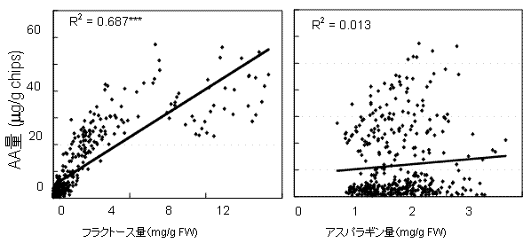 (2)AA量に及ぼす生イモの成分要因:チップ中のAA量は、生イモ中の各成分のうち、還元糖量の変化ともっともよく呼応して変化した。相関係数(R2)はフラクトース0.687(図2)、グルコー