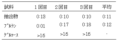 (1) 試料溶液を塗布した麺は、ポジティブコントロールのプルランと同様に10秒程度でほぐれたが、ネガティブコントロールのグルコースでは15分以上経過しても塊のままであった(表1)。