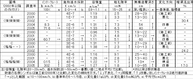 表1 調査実証圃場の土壌物理性と透排水指標値の変化