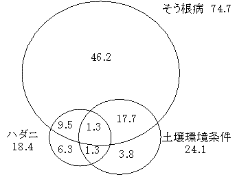 3)黄化は、そう根病、土壌環境の不良、ハダニが単独あるいは複合して起こっていた。
