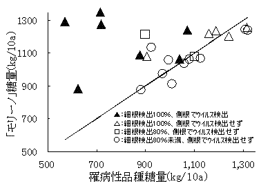 は細根及び側根におけるウイルス検出割合が有効な尺度となることが示唆され、即ち側根でウイルスが検出された区では確実に罹病性品種の糖分、糖量を上回り、細根のウイルス
