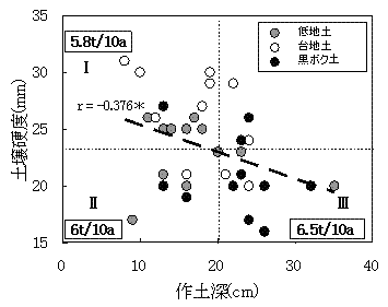 下層土の作土への混入による影響が考えられるので、幅広心土破砕の施工は有機物施用と深耕などの併用が必要と考えられた。