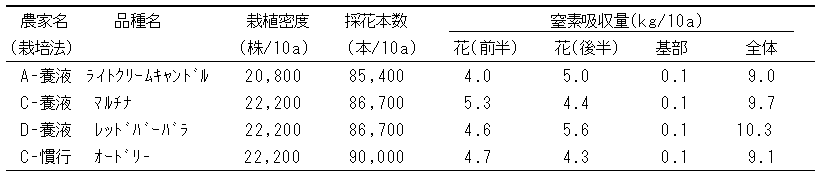 表1.カーネーションの栽植密度、採花本数および窒素吸収量(2003年)