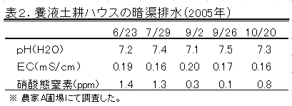2)養液土耕栽培ハウスにおける暗渠排水の硝酸態窒素濃度は1.4ppmと低く推移しており、系外への流出量は極めて少ないと考えられた(表2)。