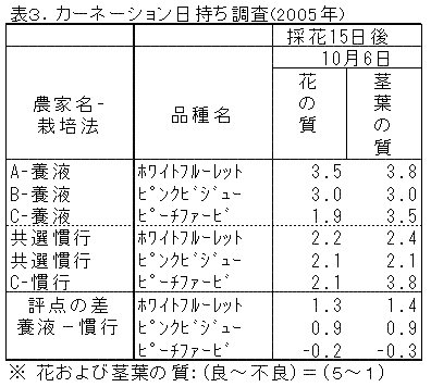 3)養液土耕栽培と慣行栽培の収量はいずれも10a当たり約7万本でほぼ同程度であった。また、日持ち性について2カ年(2004・2005年)の調査の結果、養液土耕と慣行栽培で差は認め