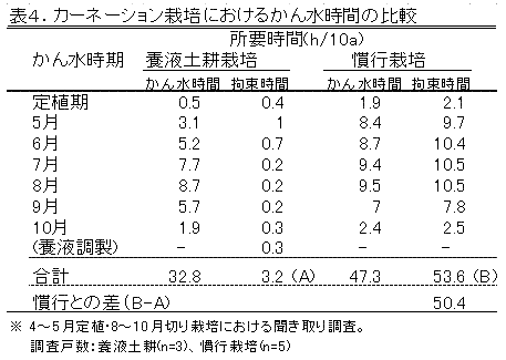 (32.8時間/10a/年)に比べて極めて短かったが、慣行栽培の作業時間は53.6時間/10a/年で、養液土耕栽培の導入により作業時間が50.4時間/10a/年短縮された(表4)。